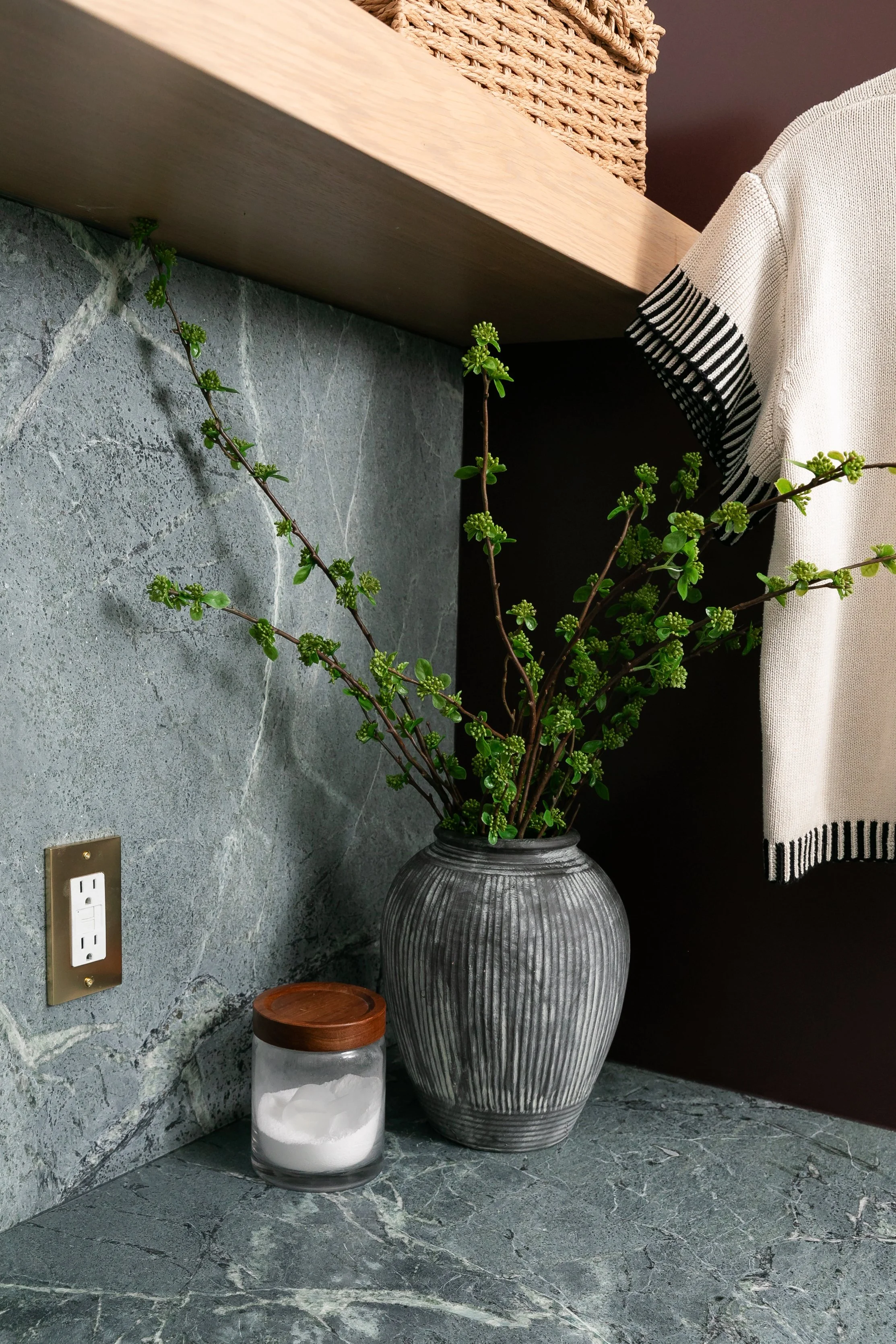 This refresh project breathes new life into a compact pantry and laundry room, transforming them into functional yet striking spaces. The design embraces bold, moody colors to add depth and drama, complemented by luxurious soapstone countertops and elegant brass accents for a touch of timeless sophistication. A checkered marble floor pattern grounds the aesthetic, infusing classic charm with a modern twist. Smart storage solutions are thoughtfully integrated to maximize efficiency, allowing these small but essential areas to shine with personality and purpose.